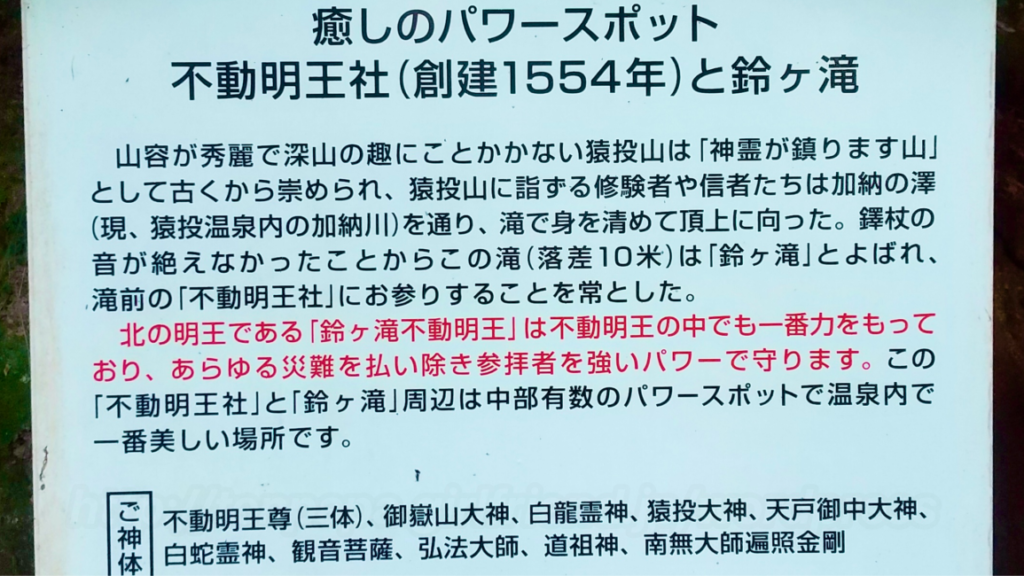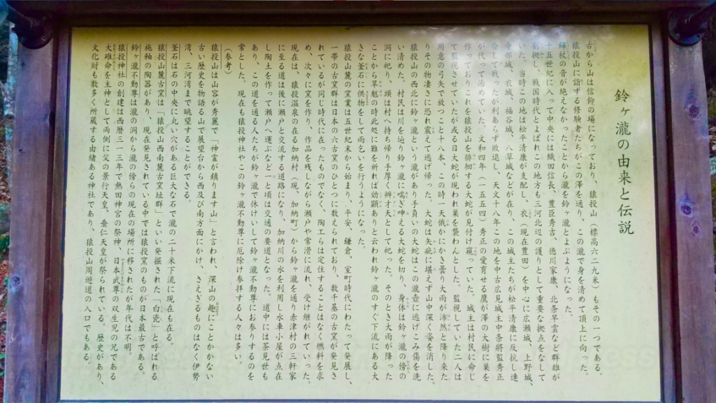 (参考)猿投山は山容が秀麗で「神霊が鎮まります山」と言われ、深山の趣にことかかない古い歴史を物語る山で展望台から西及び南方面にかけ、さえぎるものはなく伊勢湾、三河湾まで眺望することができる。釜石は石の中央に丸い穴がある巨大な石で瀧の二十米下流に現在も在る。猿投山麓古窯は「猿投山西南麓古窯址群」といい発掘された「白瓷(しらし)」と呼ばれる施釉の陶器があり、現在発見されている中では猿投窯のものが日本最古である。鈴ヶ瀧不動尊は瀧の洞から瀧の傍らの現在の場所に移されたが年代は不明。猿投神社の創建は西暦313年で熱田神宮の祭神、日本武尊の双生児の兄である大碓命を主神として両側に父の景行天皇、垂仁天皇が祭られている。歴史があり、文化財も数多く所財する由緒ある神社であり、猿投山周遊道の入口でもある。【立て看板より出典】